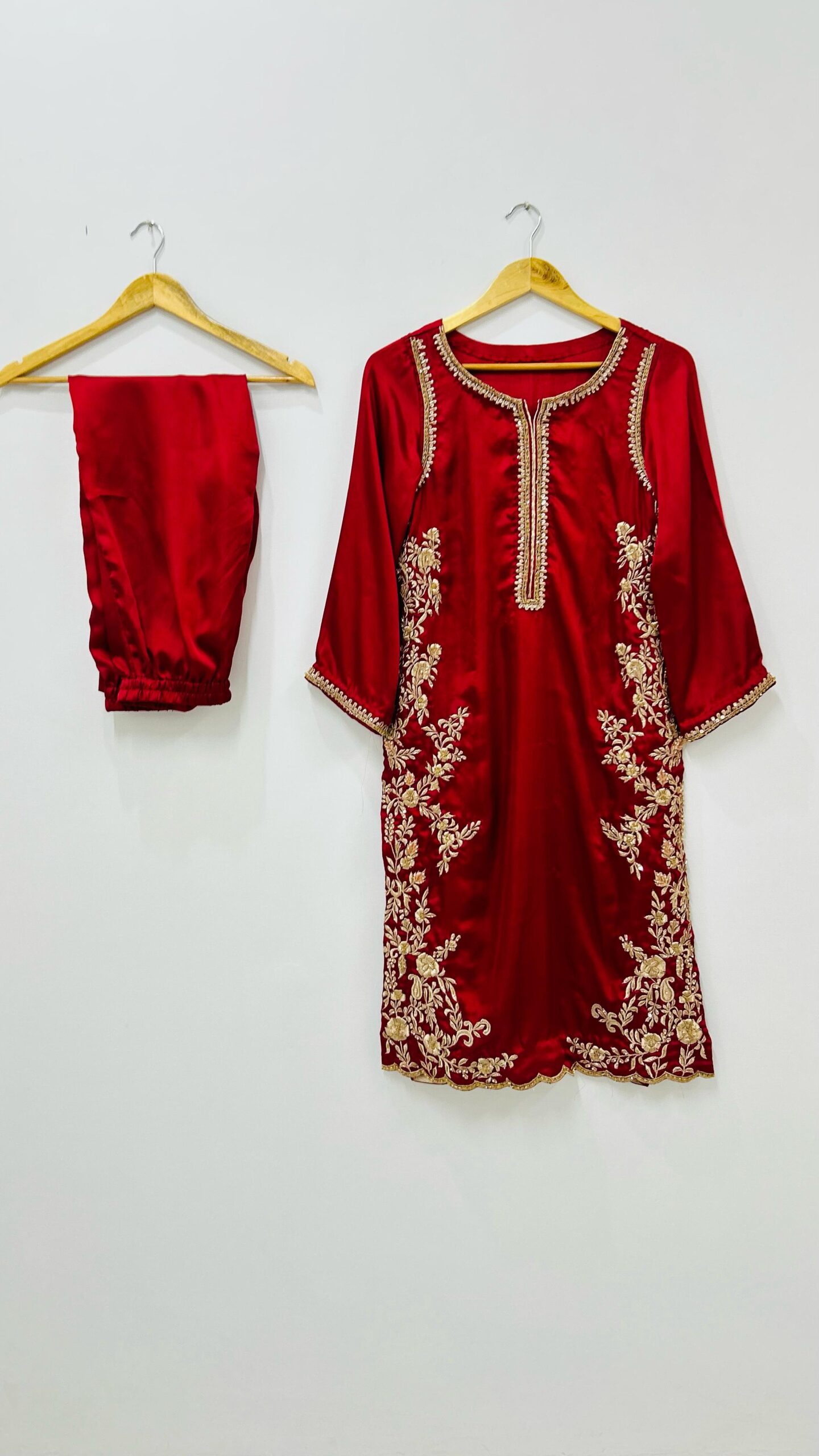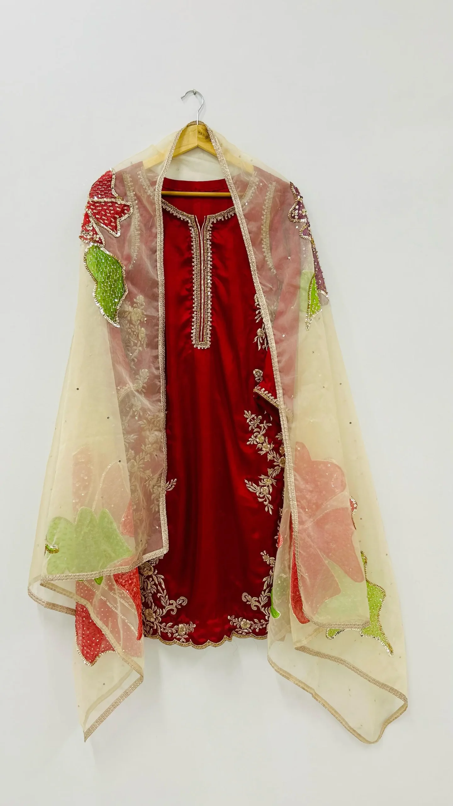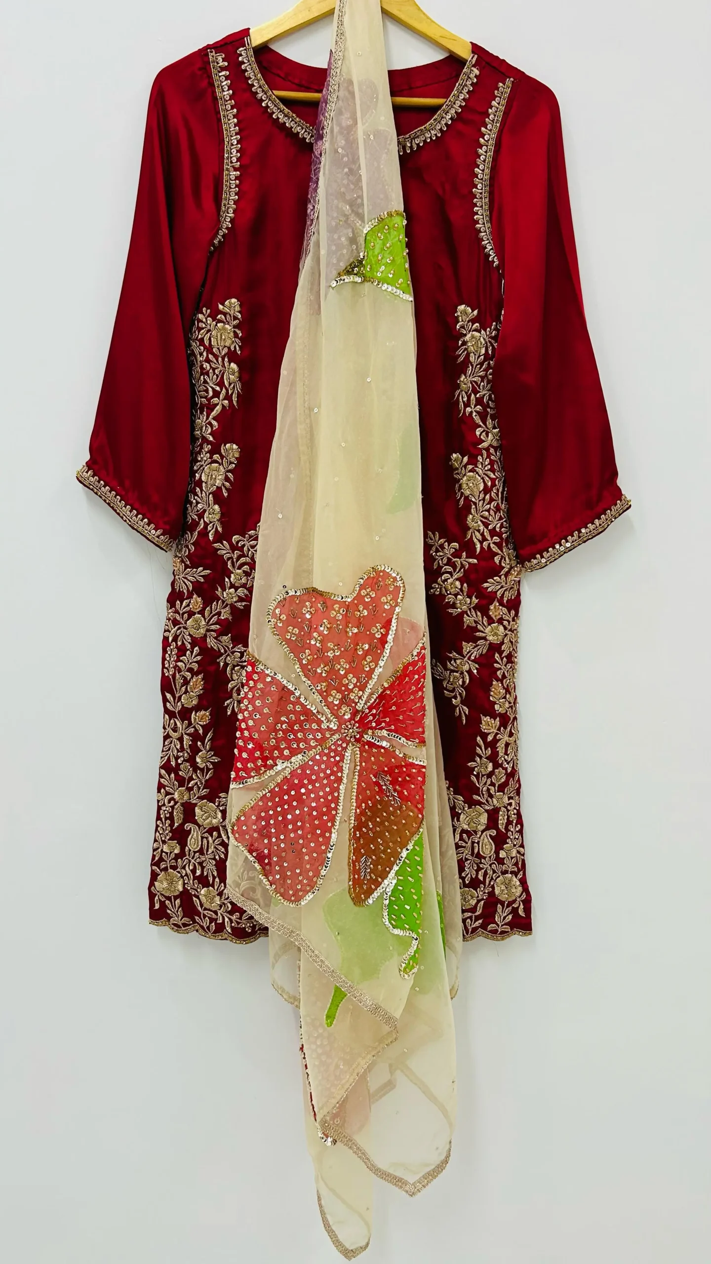 Organza Hand painted dupatta paired with maroon silk 2 piece machine embroidered and hand work shirt.